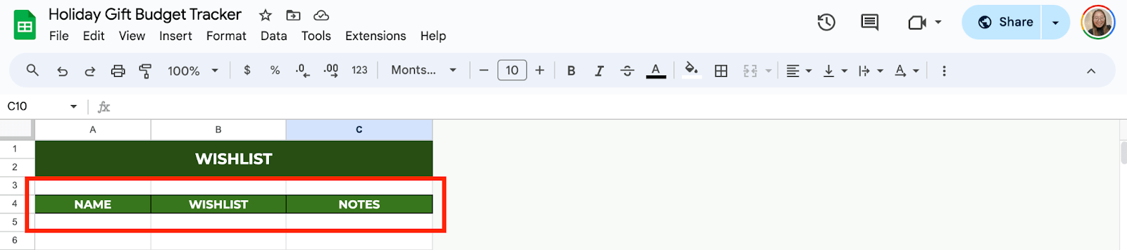 Now, start entering the names of people you’re buying gifts for, the gifts you’re considering, your budget for each gift, and any costs if you’ve already made purchases. You’ll leave the “Purchased?” column empty for now.
