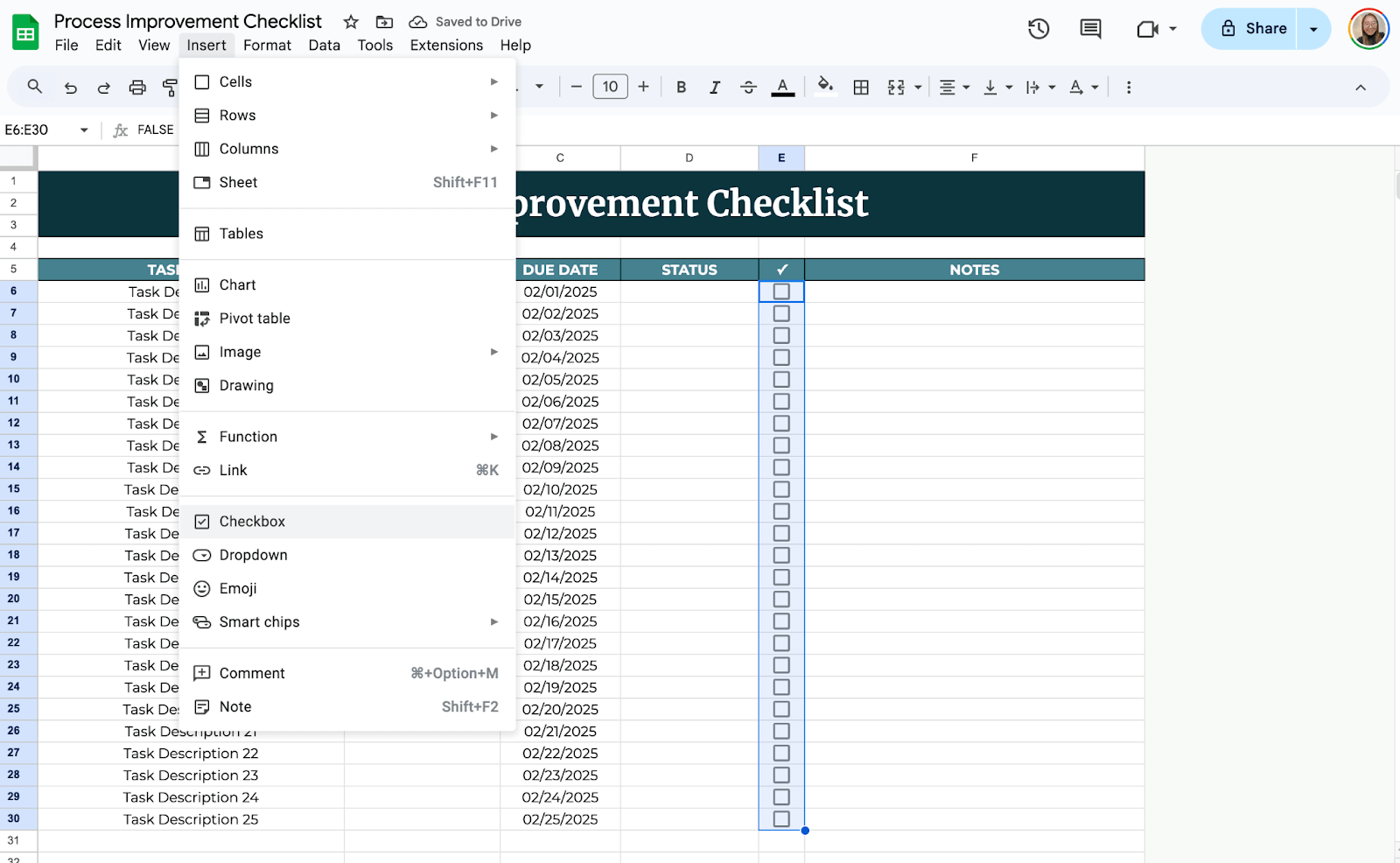 To add checkboxes, select the cells where you want them to appear, then click Insert > Checkbox. This is useful for marking tasks as complete.