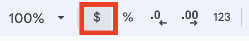 • Use currency formatting for the price and total columns. Select the cells with amounts, click the “$” icon from the toolbar, and Google Sheets will format them as currency.