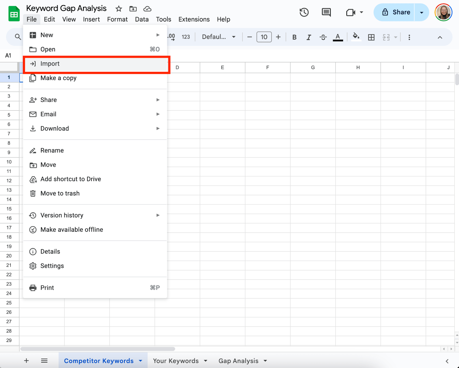 Let’s do the Competitor Keywords first. Select the “Competitor Keywords” sheet, click File > Import, then upload the CSV.
