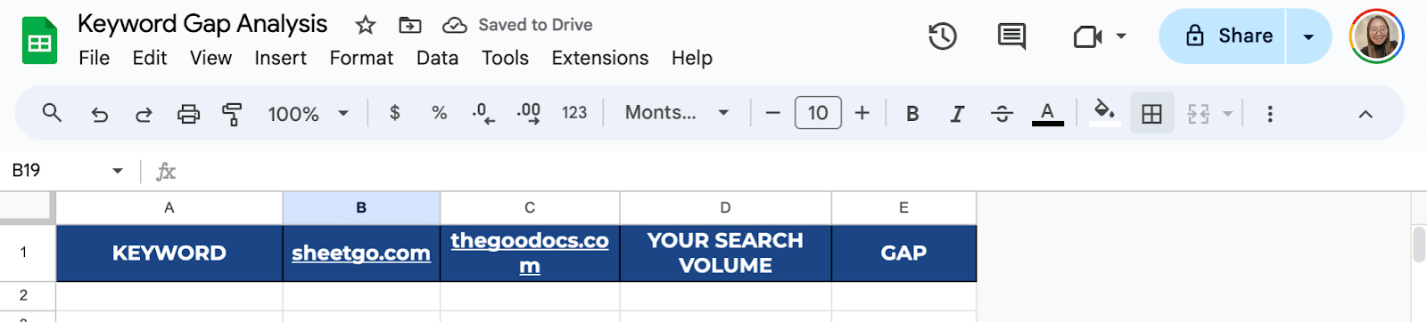 Get a copy of the free Keyword Gap Analysis Template. I’ve already populated some cells as examples, but you can customize them as needed,
