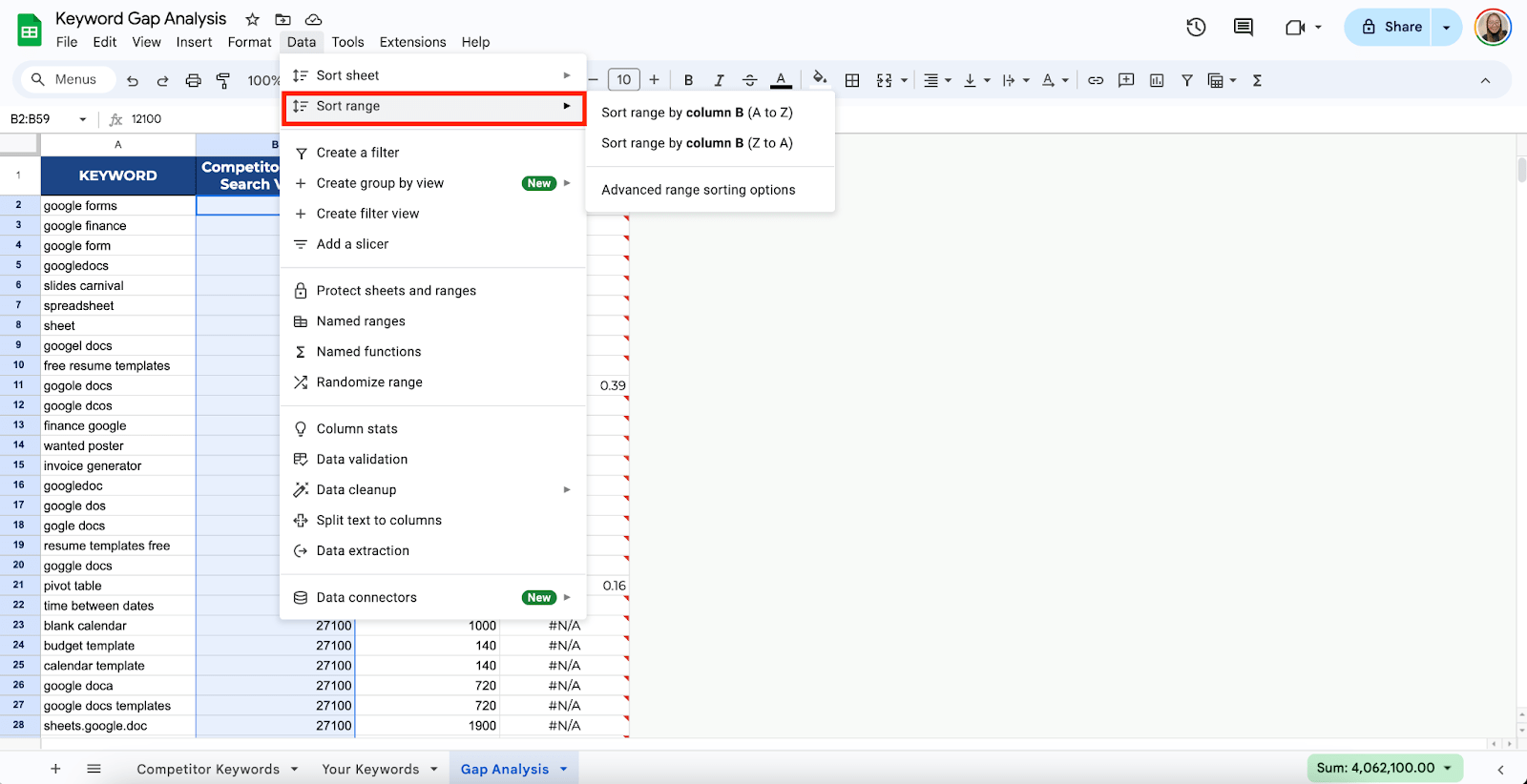 You can sort the Gap Analysis sheet by Column B to focus on keywords with higher search volumes first. Select the range you want to sort, then click Data > Sort range.